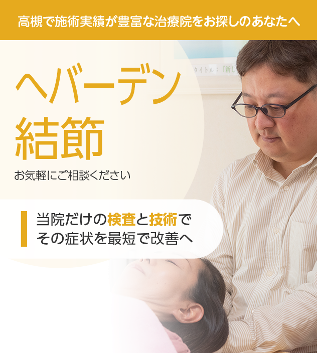 当院では、さまざまな症状でお困りの方が多くお越しいただいていますが、その中でも、へバーデン結節でお悩みの人は、特に多く来院されています。